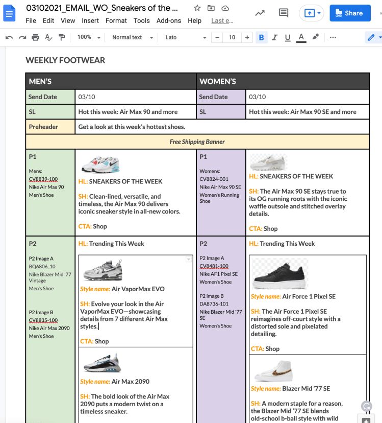 Sneakers of the Week is a weekly franchise, so naturally I created a copy template to use week over week. Adding thumbnails to the doc is an extra step in the front end, but it ultimately saves time in the backend when QAing the designs. Definitely don’t want the wrong shoe in there.