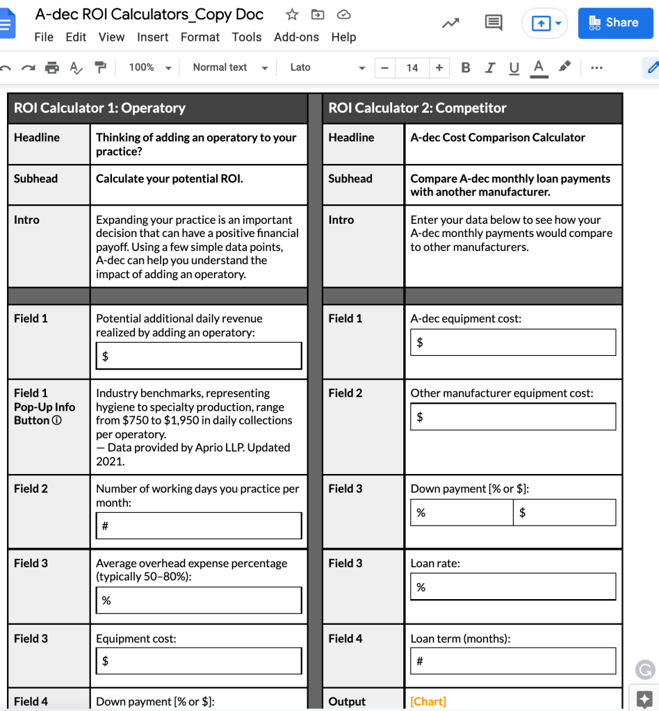 I whipped up this copy doc to reflect as closely as possible the two calculators’ designs. Tables within tables. The mirroring made it easier for the designer to know exactly which copy to place where. Copy docs are my happy place.
