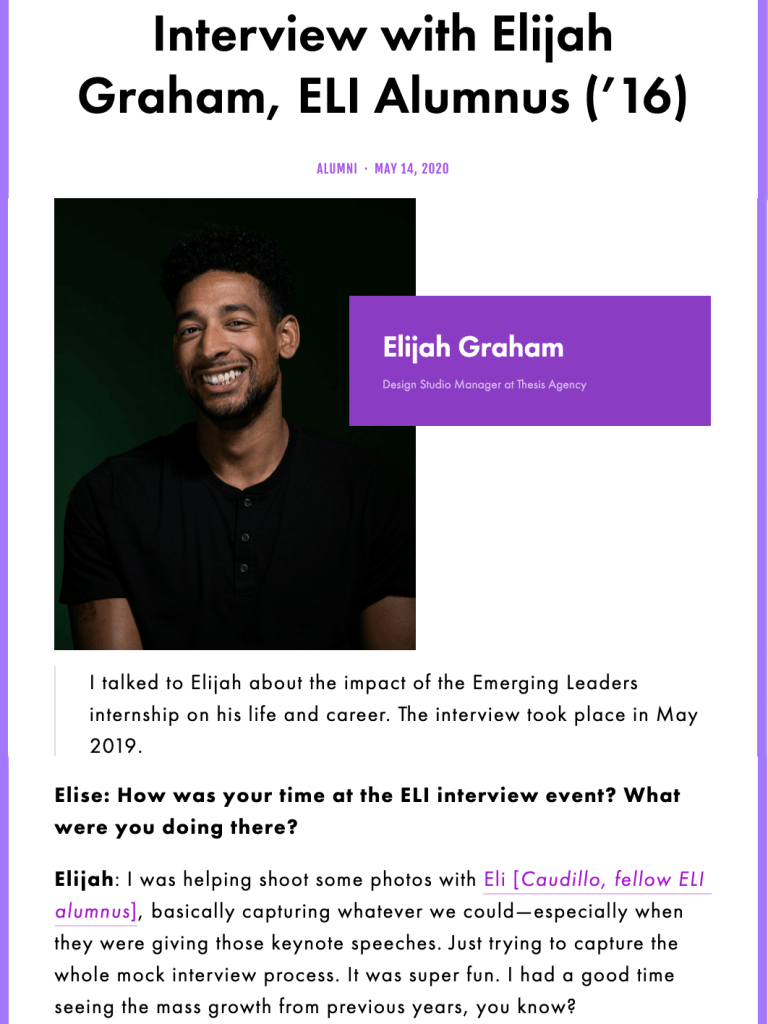 I took the initiative to create an interview series of former interns because I knew they each had valuable insights. Over the course of a year, I interviewed eight former EL interns who’d landed jobs at Thesis. The process included recording, cleaning transcripts, and receiving feedback from the interviewees. Read the whole interview and others.